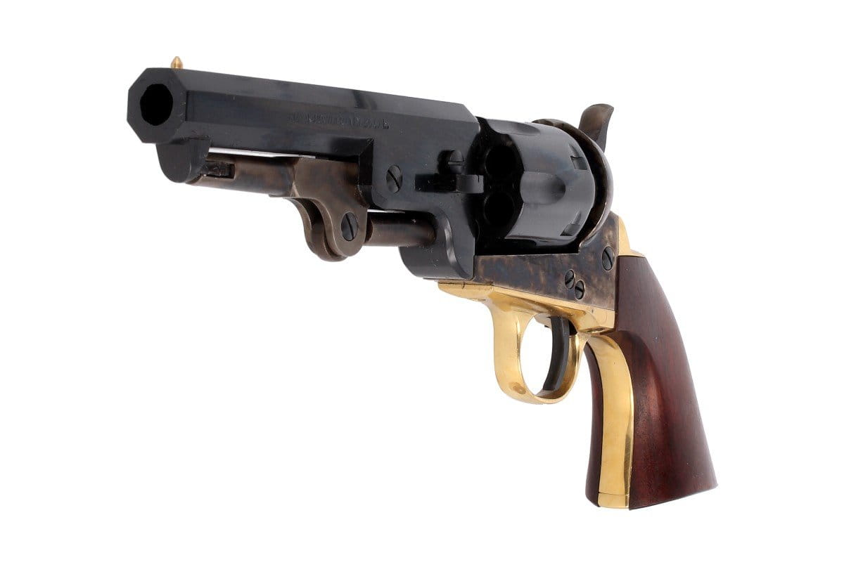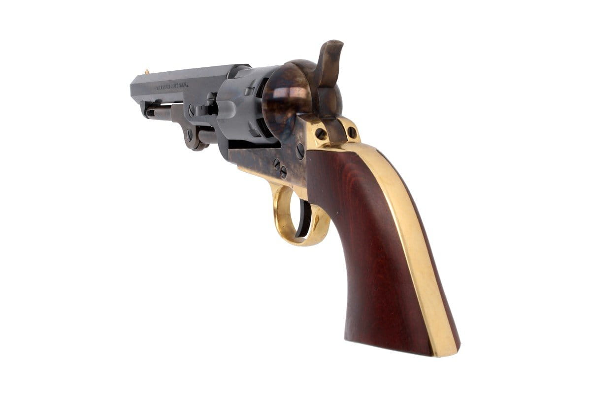 1851 Colt Navy Yank Sheriff TS .36, zaprojektowany przez Samuela Colta sześciostrzałowy kapiszonowy rewolwer czarnoprochowy w kalibrze .36. Ładowany odprzodowo z ramą stalową otwartą oraz grawerowanym wklęsłym bębnem, sceną zwycięstwa II Texas Navy w bitwie morskiej pod Campeche w roku 1843. Wersja Sheriff z krótką lufą, doskonała do szybkiego dobycia oraz szybkiego strzelania podczas zawodów dynamicznych.